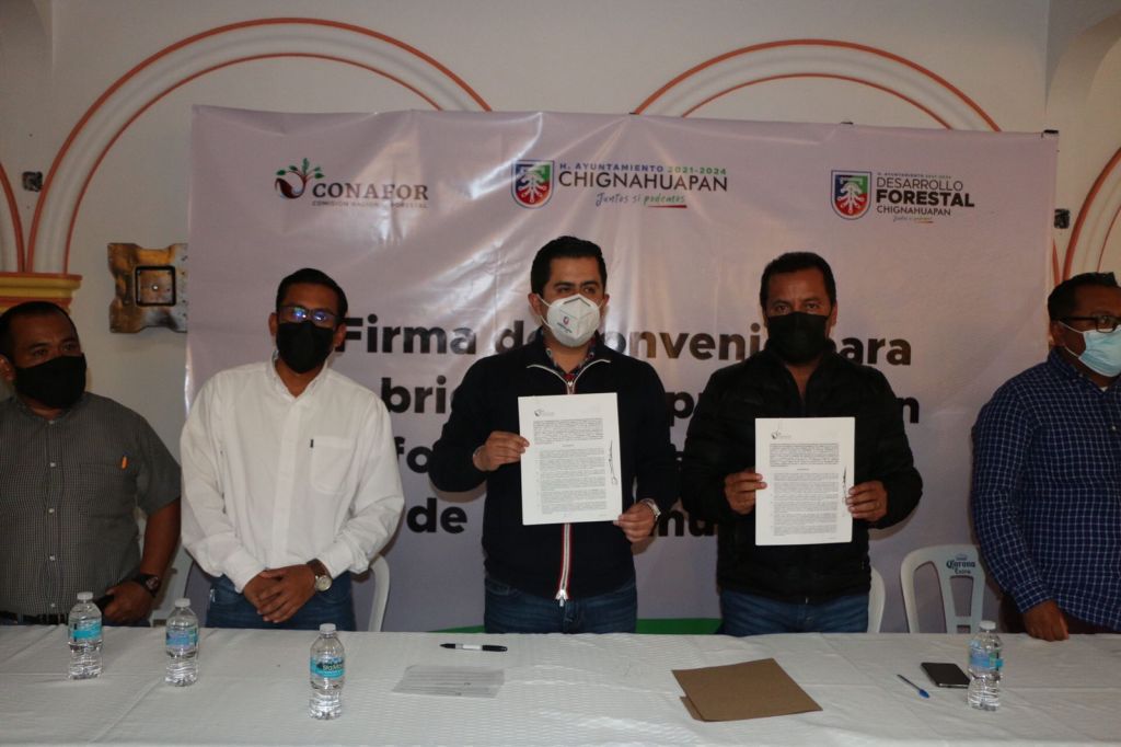 Chignahuapan, Puebla.- El Presidente Municipal, Lorenzo Rivera Nava, encabezó la firma de convenio a través de la Dirección de Desarrollo Forestal y la CONAFOR con el fin de crear una brigada única en Estado de Puebla que brinde protección a los bosques en el municipio y contribuya a la reforestación, prevención, control y eliminación de plagas.