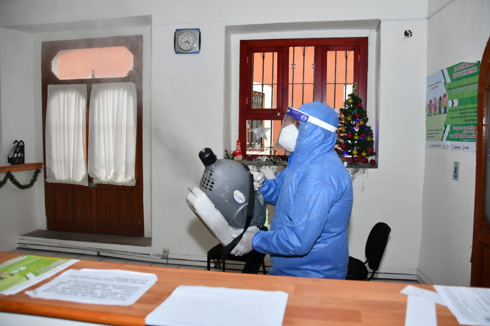 Con el propósito de garantizar espacios seguros para los trabajadores y usuarios que acuden a realizar un trámite o servicio, el H. Ayuntamiento de Huamantla, realizó la desinfección total de las oficinas que componen el Palacio Municipal.