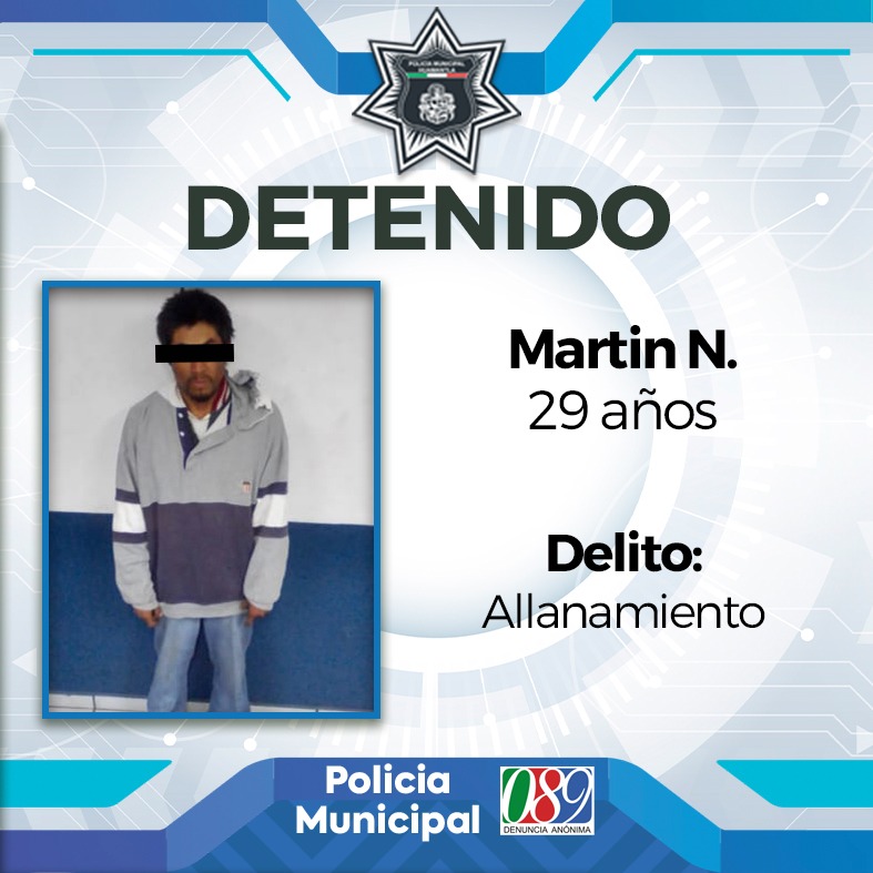 Derivado de una llamada de emergencia a los números de la Dirección de Seguridad Pública, Tránsito y Protección Civil de Huamantla, se logró la detención de un masculino por allanamiento en la casa parroquial de la comunidad de Benito Juárez.