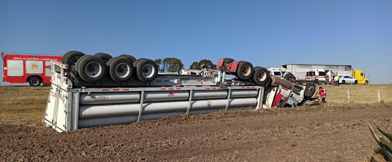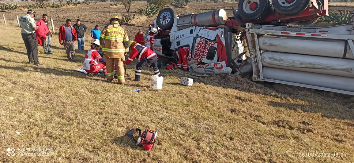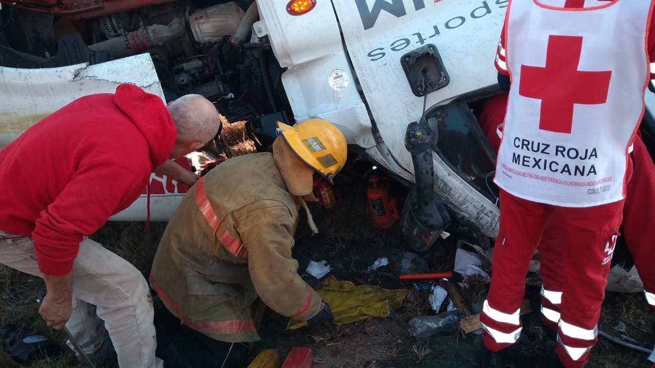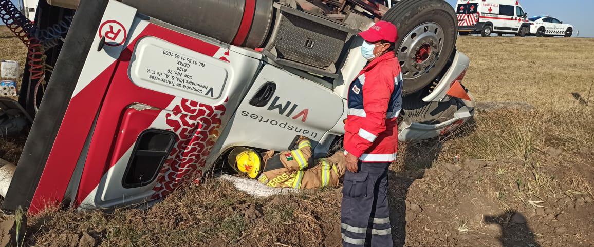 Personal del Heroico Cuerpo de Bomberos se encargó de auxiliar a la persona que se encontraba prensada en un camión tipo Trailer de la marca Freightliner, donde procedieron a utilizar el equipo libra (tijeras de la vida) para poder liberarlo y ser canalizado al hospital más cercano para su atención médica.