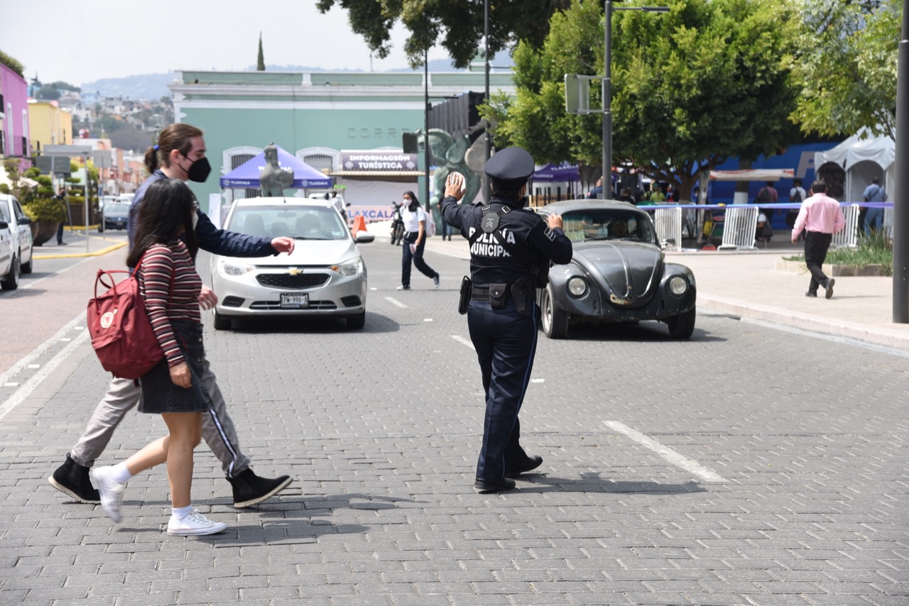 Elementos de la Dirección de Seguridad Ciudadana y Movilidad ya abanderan cierres viales en las principales calles del centro de Tlaxcala Capital a fin de garantizar el tránsito y seguridad de los atletas y asistentes a la justa internacional.
