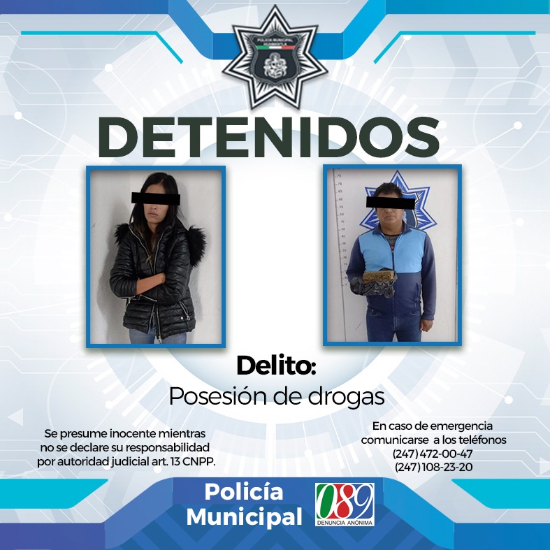 Al inspeccionar a los tripulantes y el vehículo, personal de la policía municipal logró observar que transportaban un paquete con las características propias de la mariguana con aproximadamente un kilogramo de peso; por lo que Melitón N. de 42 años de edad, y su acompañante Ariadna N. de 19 años de edad, fueron detenidos por posesión de drogas.