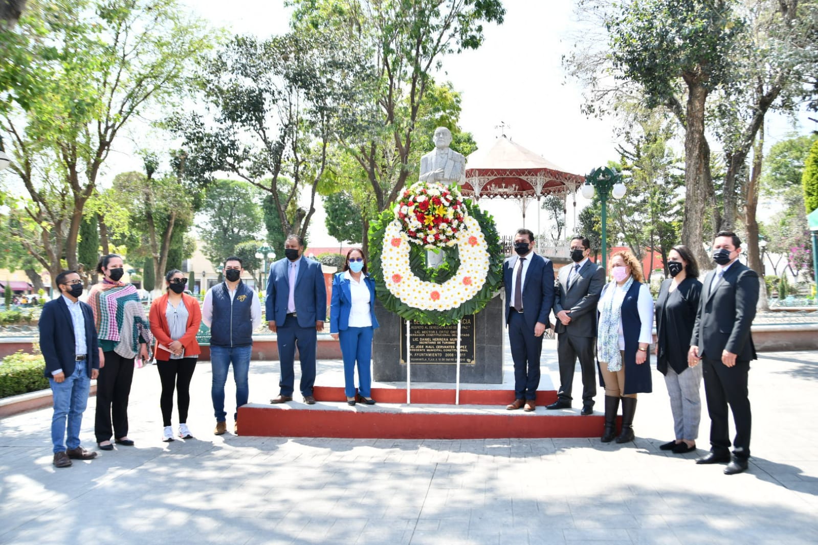 Para concluir este acto cívico, las autoridades municipales y de comunidad colocaron una ofrenda floral y montaron una guardia de honor en el monumento a Benito Juárez, mientras que los asistentes guardaron un minuto de silencio.