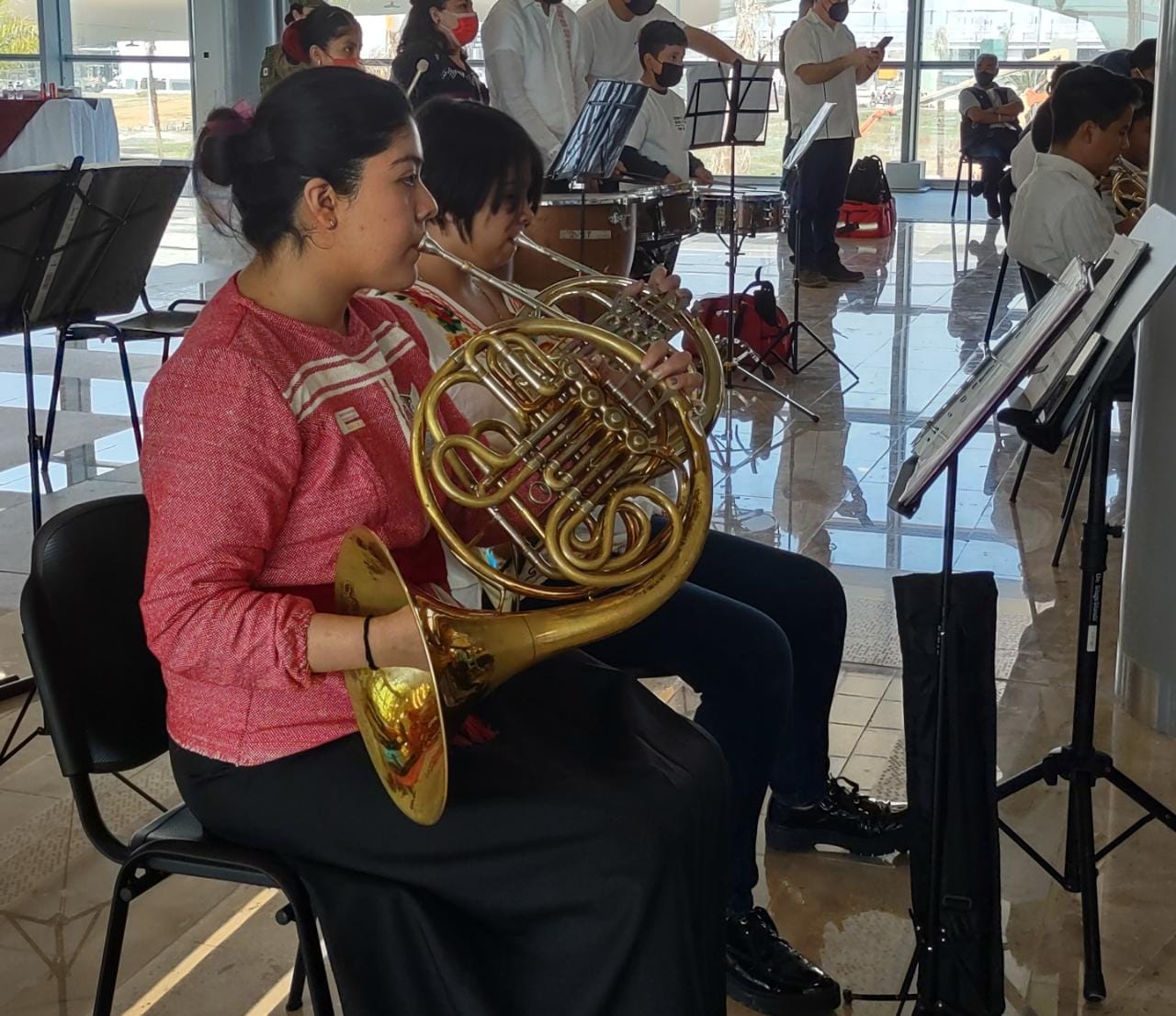 Los alumnos de la casa de música con sede en Santa Cruz Tlaxcala deleitaron con su música a los asistentes a la inauguración del nuevo Aeropuerto Internacional Felipe Ángeles (AIFA), ceremonia encabezada por el presidente de la República, al que asistieron la gobernadora de Tlaxcala y el titular de la Secretaría de Cultura (SC) local.
