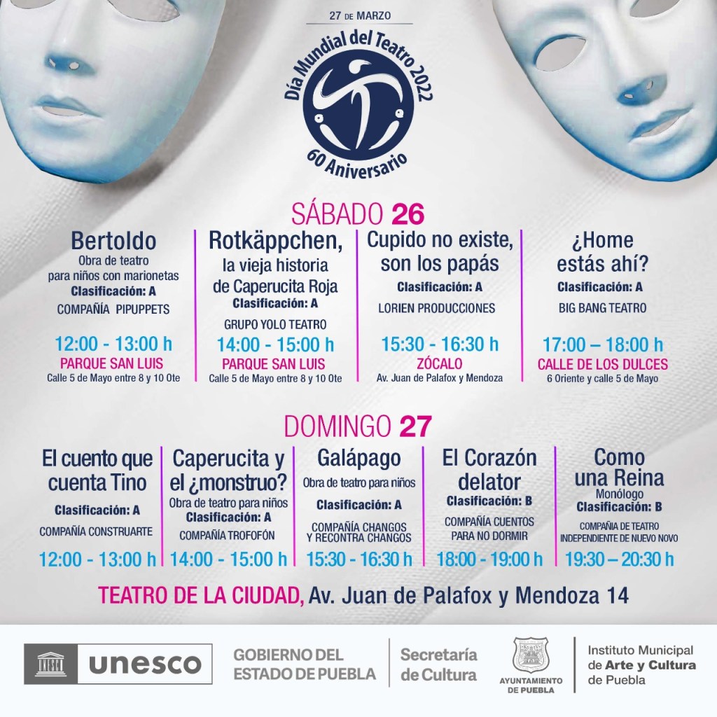 Cuentacuentos, danzas, puestas en escena itinerantes y obras especiales están entre las actividades que el Instituto Municipal de Arte y Cultura del Ayuntamiento de Puebla ha preparado para celebrar este fin de semana el Día Mundial del Teatro.