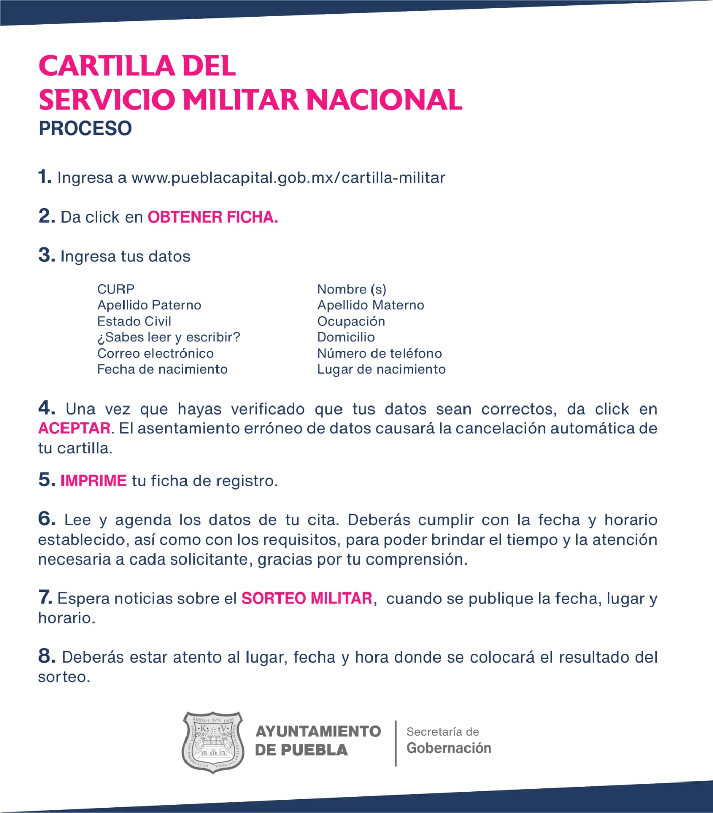 Jóvenes nacidos en 2004 y remisos ya pueden iniciar el trámite para obtener su Cartilla del Servicio Militar Nacional, pues la Secretaría de Gobernación del Ayuntamiento de Puebla abrió la convocatoria de registro, a través del portal http://www.pueblacapital.gob.mx.