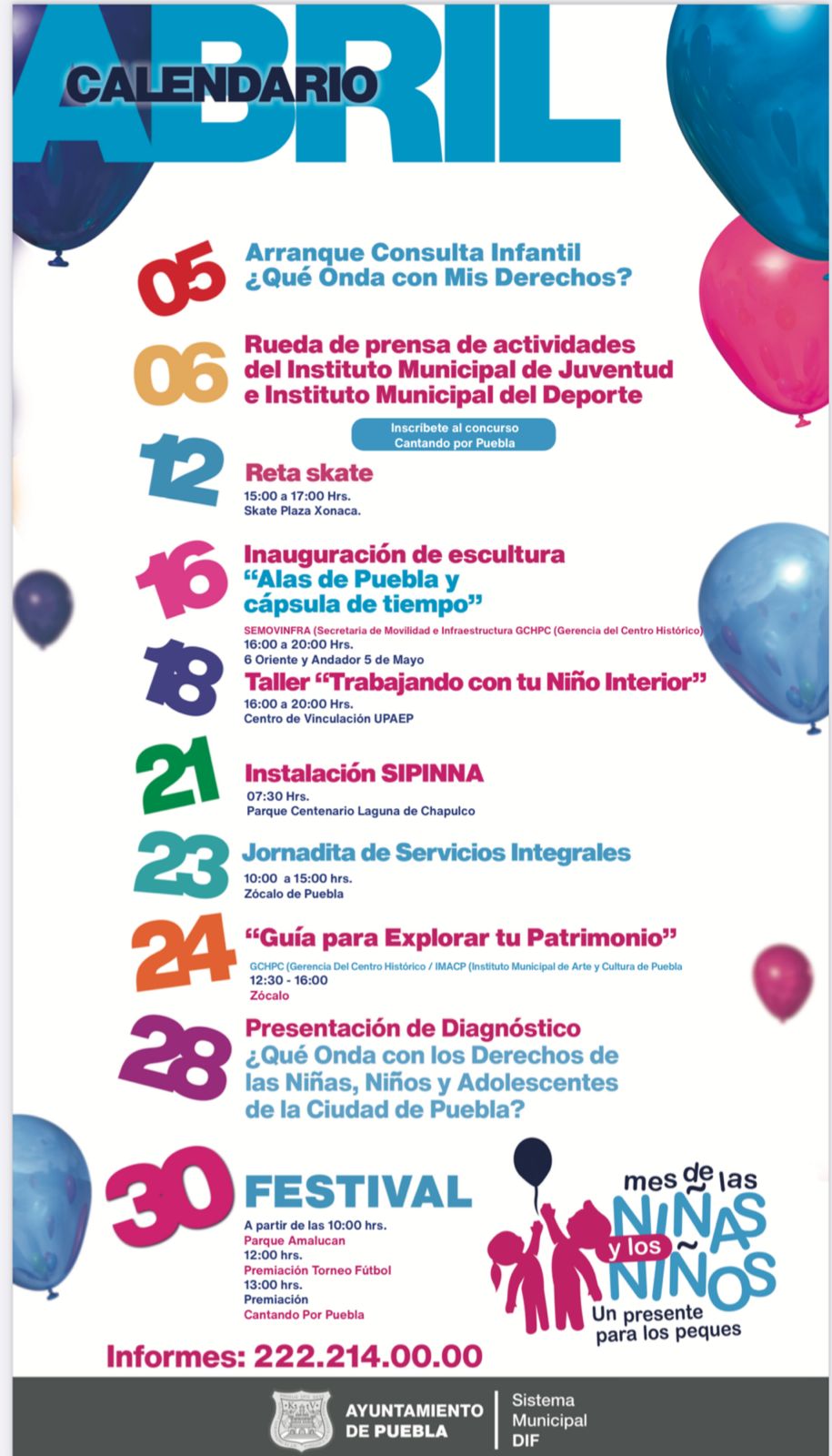 -12 de abril, Reta Skate, en plaza Xonaca y Conmemoración del Día Internacional de los Niños en Situación de Calle. - 16 de abril, inauguración de escultura «Alas de Puebla» y cápsula de tiempo
