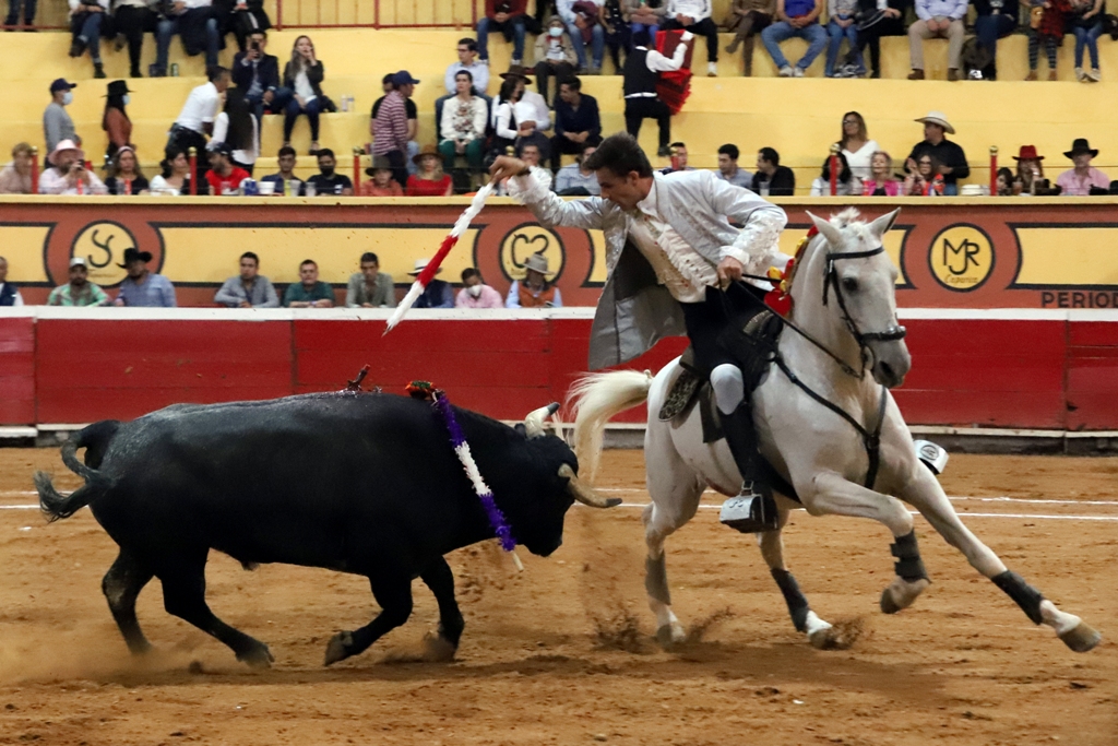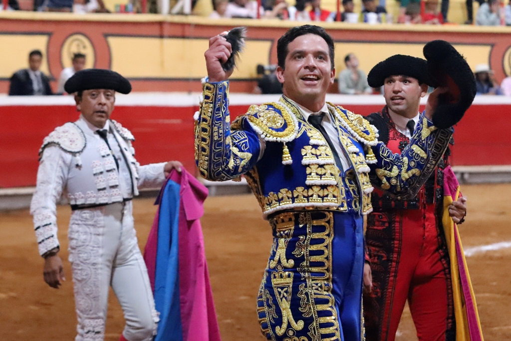 Ovación en el tercio tras aviso, acompañado del cara de los Forcados Amadores de México, Hiram Gallardo, tras espectacular pega.