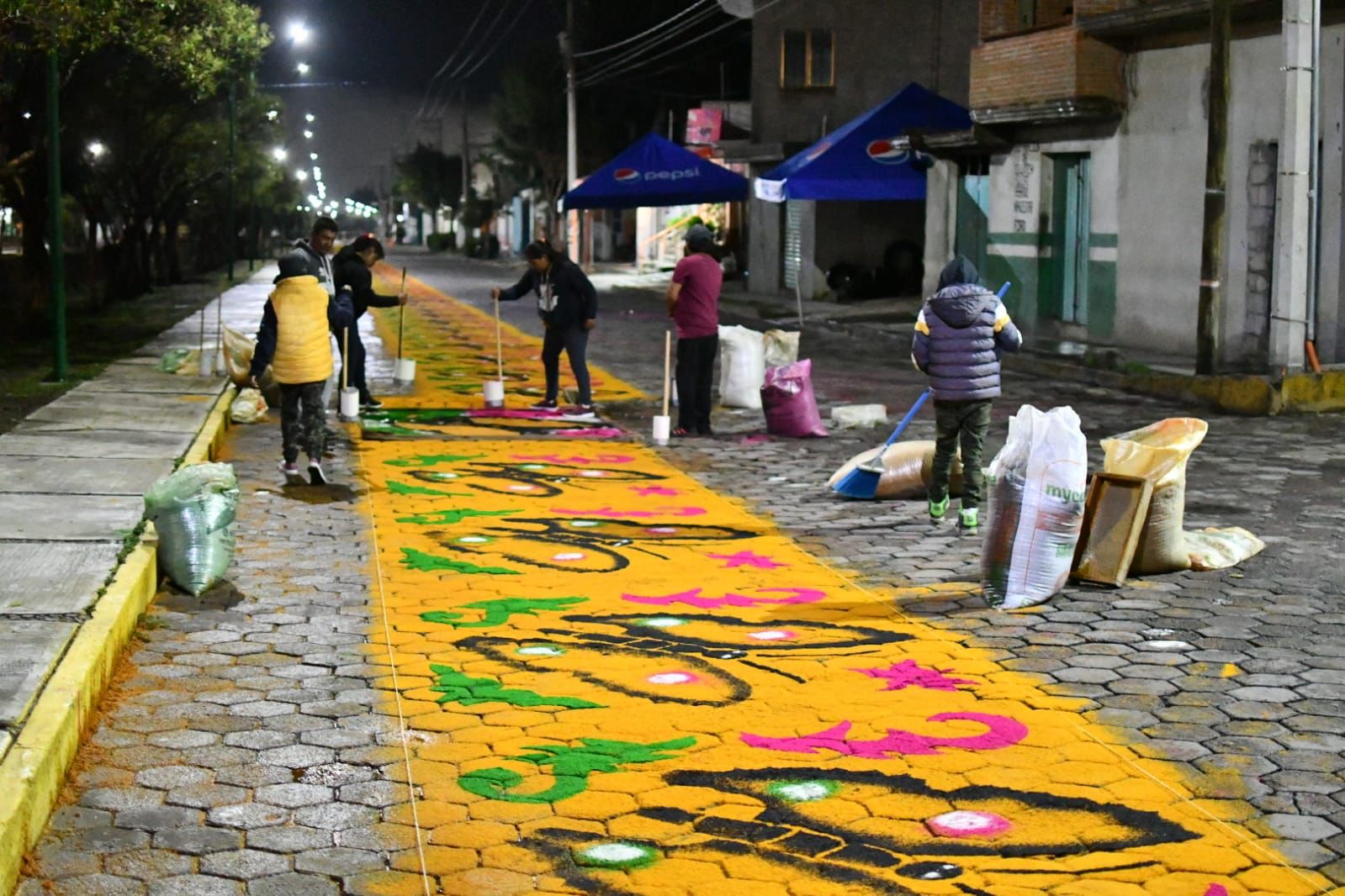 Cuando empezaba a caer la noche, frente a la Presidencia Municipal, la administración que preside Salvador Santos Cedillo, dispuso de un cartel artístico que amenizó el paso de familias y visitantes que admiraban los tapetes de aserrín colocados para el paso de la Virgen de La Caridad.