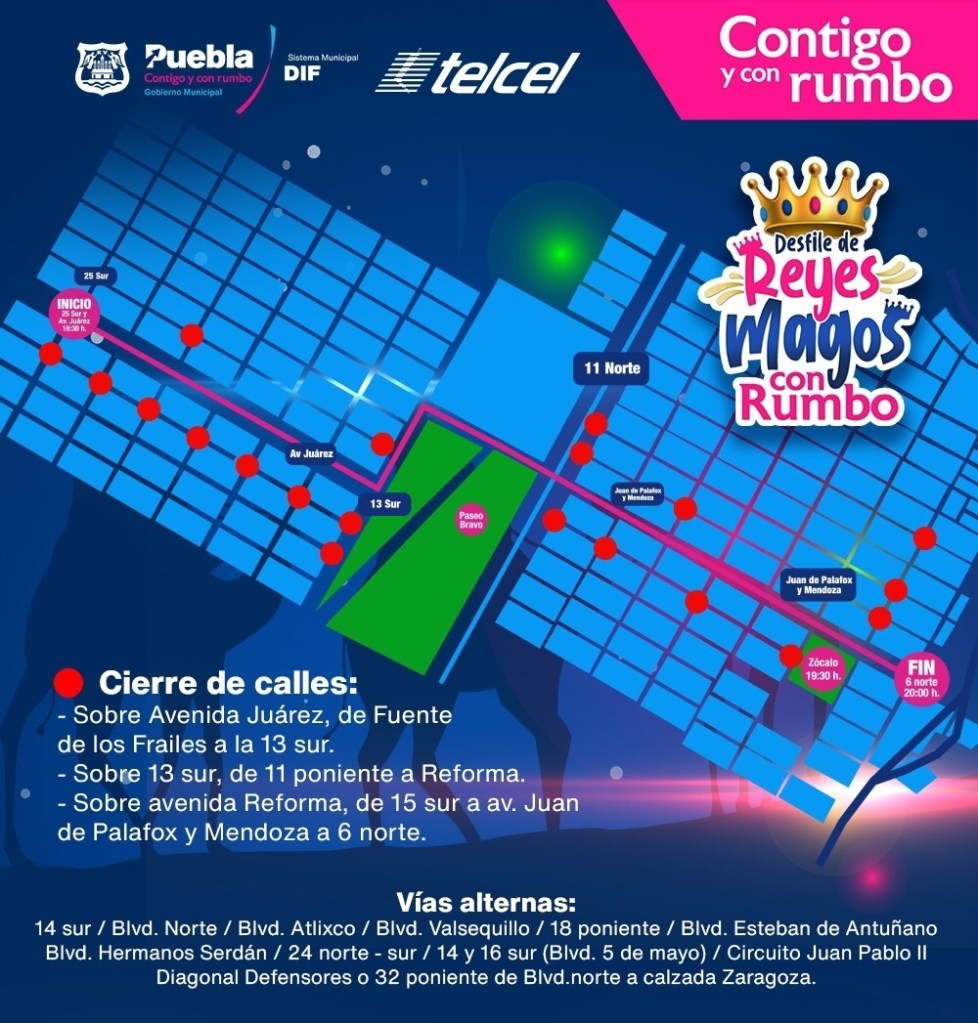 El Desfile de Reyes Magos también será transmitido a través de la página de Facebook del Gobierno Municipal: @HAyuntamientoDePuebla, a partir de 19:00 horas, por lo que Iván Toxqui Mancilla, Subdirector Comercial de Telcel –compañía patrocinadora de este evento-, pidió unirse a esta celebración y llevar alegría a las y los poblanos más pequeños con este espectáculo de carros alegóricos y contingentes que se ha preparado.