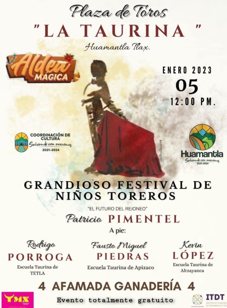 El día 5 de enero a las 12 del día se llevará a cabo en la Plaza «La Taurina» de Huamantla, Pueblo Mágico, el Grandioso Festival de Niños Toreros con el debut del Rejoneador Patricio Pimentel de Huamantla y los becerristas Rodrigo Porroga de la escuela de Tetla, Fausto Miguel Piedras de la escuela de Apizaco y Kevin López de la escuela de Atltzayanca, para lidiar 4 becerras de La Trasquila, en un evento totalmente gratuito organizado por el Presidente Municipal Salvador Santos Cedillo, el coordinador de Arte y Cultura Taurina de Huamantla matador Joaquín Angelino de Arriaga y el Instituto Tlaxcalteca de Desarrollo Taurino que dirige el matador José Luis Angelino.