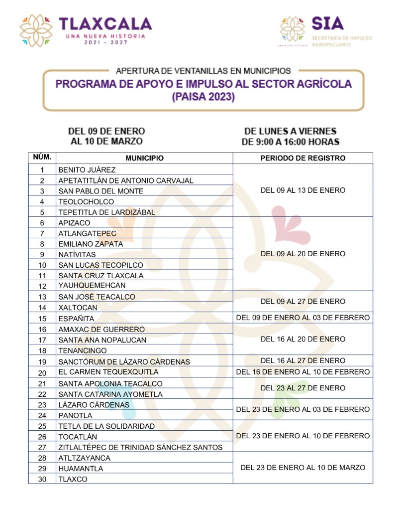 El gobierno del estado, a través de la Secretaría de Impulso Agropecuario (SIA), convoca a todas las personas productoras agrícolas de la entidad a registrarse en el Programa de Apoyo e Impulso al Sector Agrícola (PAISA) 2023, para obtener subsidios parciales en insumos básicos como fertilizantes y semillas.