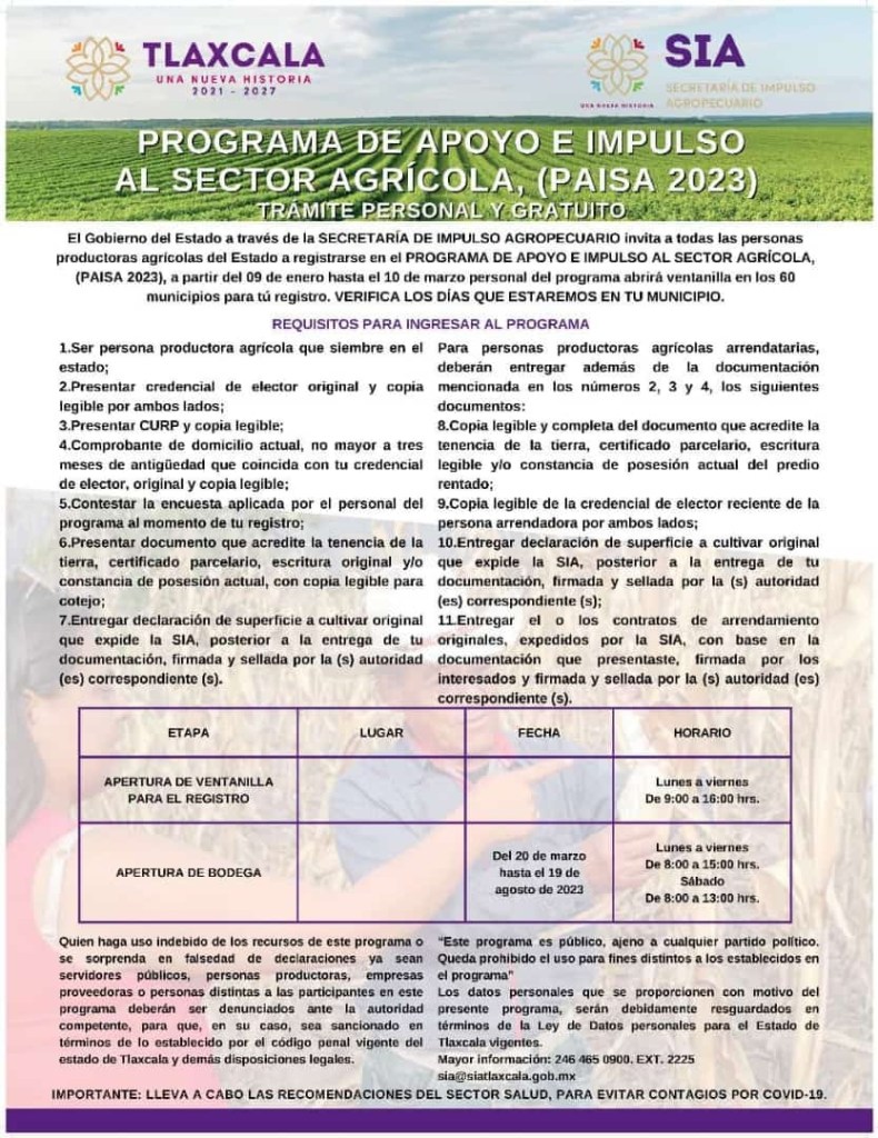 El Ayuntamiento de Chiautempan través de la Dirección de la Unidad Municipal de Protección al Medio Ambiente y Desarrollo Agropecuario en coordinación la Secretaría de Impulso Agropecuario (SIA), convocan a los chiautempenses que se dediquen a la producción agrícola a registrarse en el Programa de Apoyo e Impulso al Sector Agrícola (PAISA) 2023.