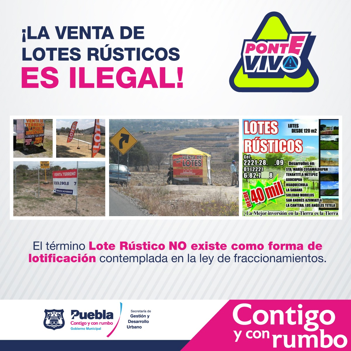Asimismo, se recuerda a la población que la venta de «Lotes Rústicos» es ilegal; el término no existe como una forma de lotificación contemplada en la Ley de Fraccionamientos, por lo que la publicidad que ofrece este tipo de terrenos debe considerarse como un tipo de fraude.
