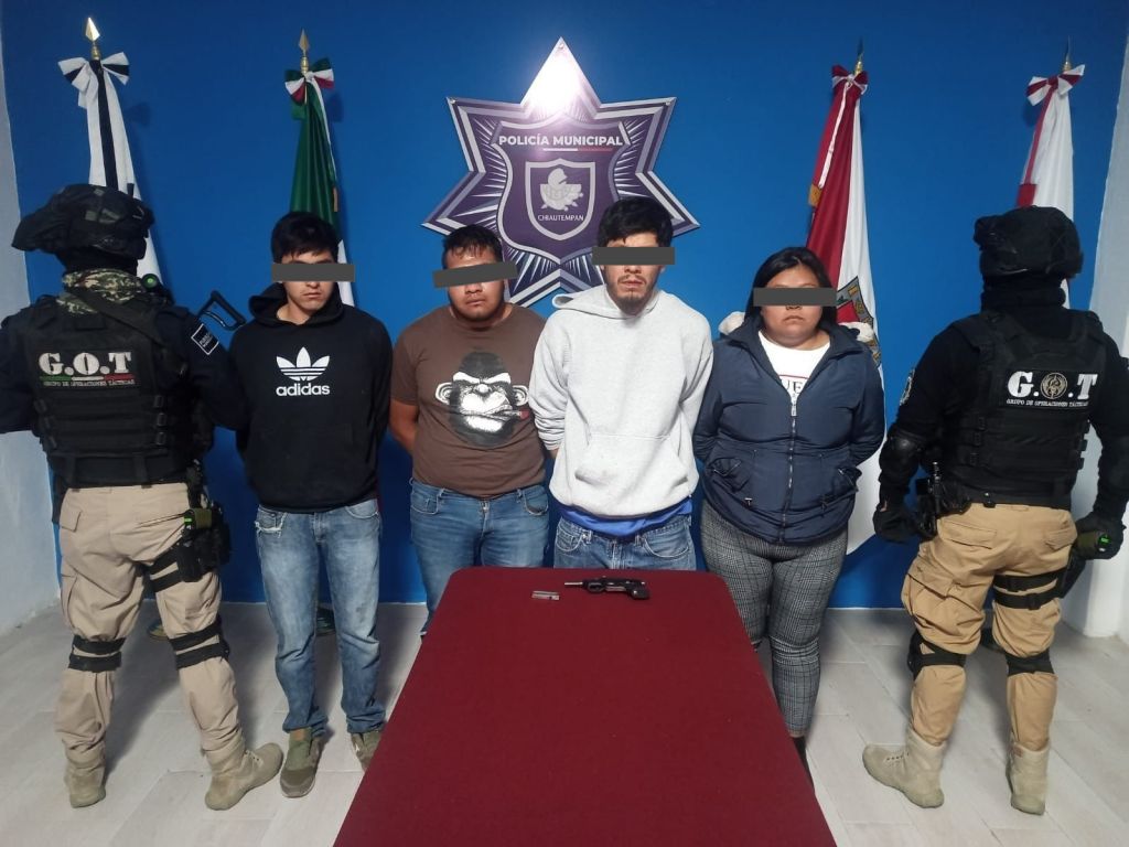 Así, se detuvo a Dulce N., 27 años de edad; Juan N., de 24 años de edad; Isaac N., de 21 años de edad y que cuenta con antecedentes penales por robo calificado a negocio y Marco Antonio N., de 32 años de edad. También, se puso a disposición un arma de fuego corta junto con siete cartuchos útiles, mientras que la unidad Volkswagen tipo Golf, fue remolcada al corralón para los efectos correspondientes.