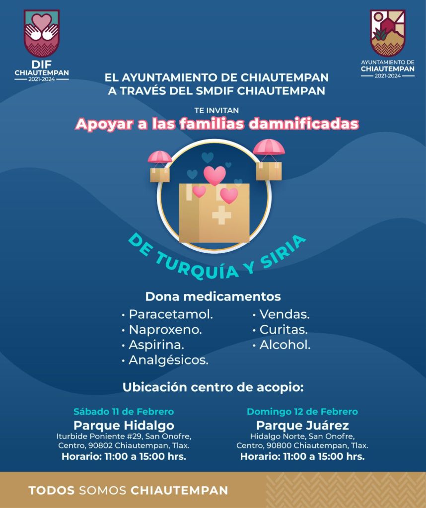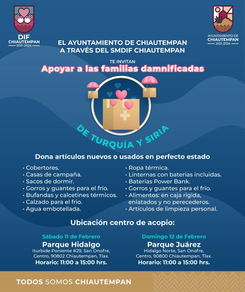 El Ayuntamiento de Chiautempan a través del Sistema Municipal para el Desarrollo Integral de la Familia SMDIF, invita a toda la ciudadanía a participar este sábado 11 y domingo 12 de febrero a la campaña de recolección en apoyos para las familias damnificadas de los países de Turquía y Siria.