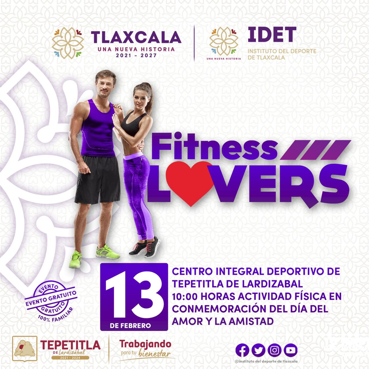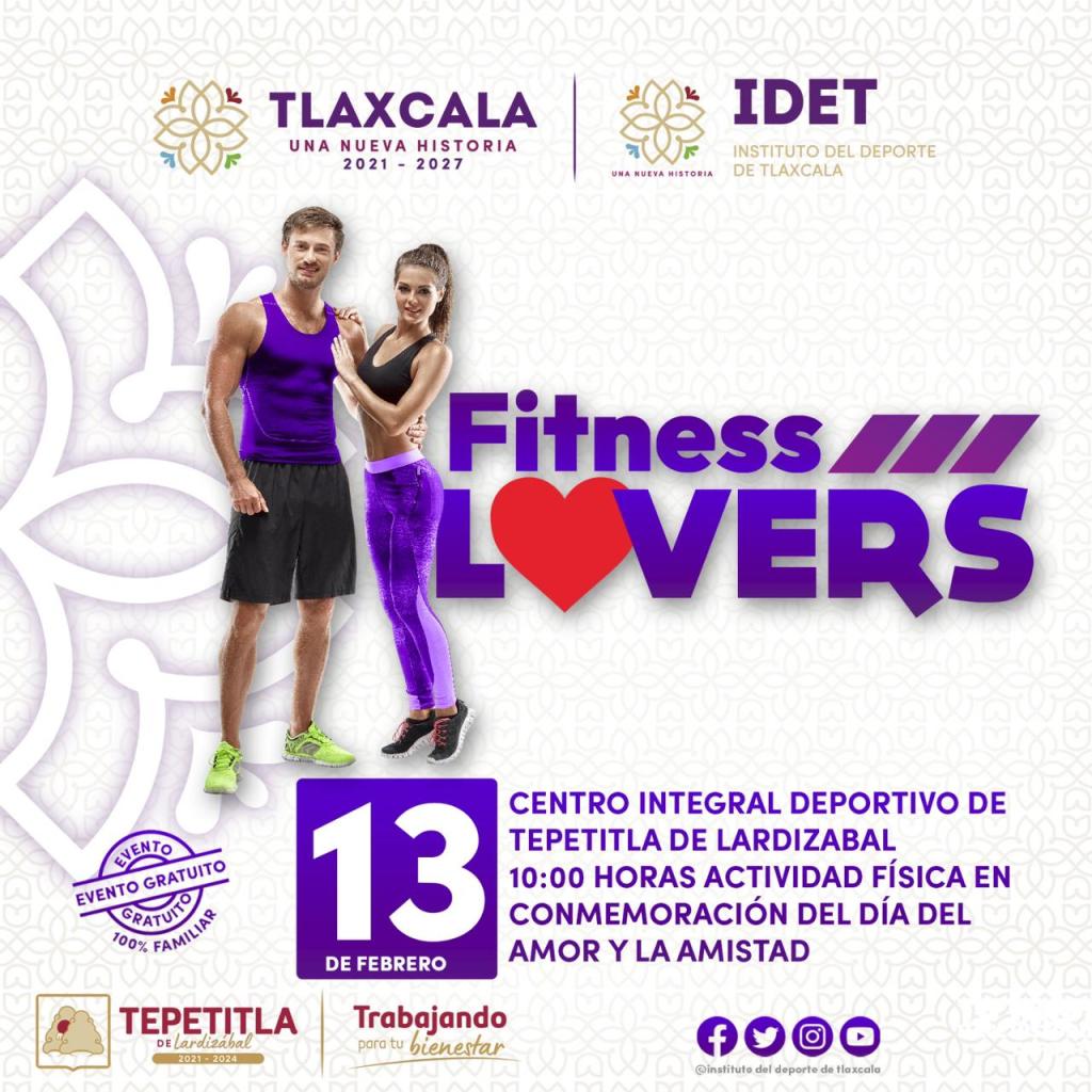 El gobierno del estado, a través del Instituto del Deporte de Tlaxcala (IDET), activará el programa «Fitness Lovers» como parte de la conmemoración del día del Amor y la Amistad, el cual se realizará el próximo lunes 13 de febrero en el municipio de Tepetitla de Lardizábal.