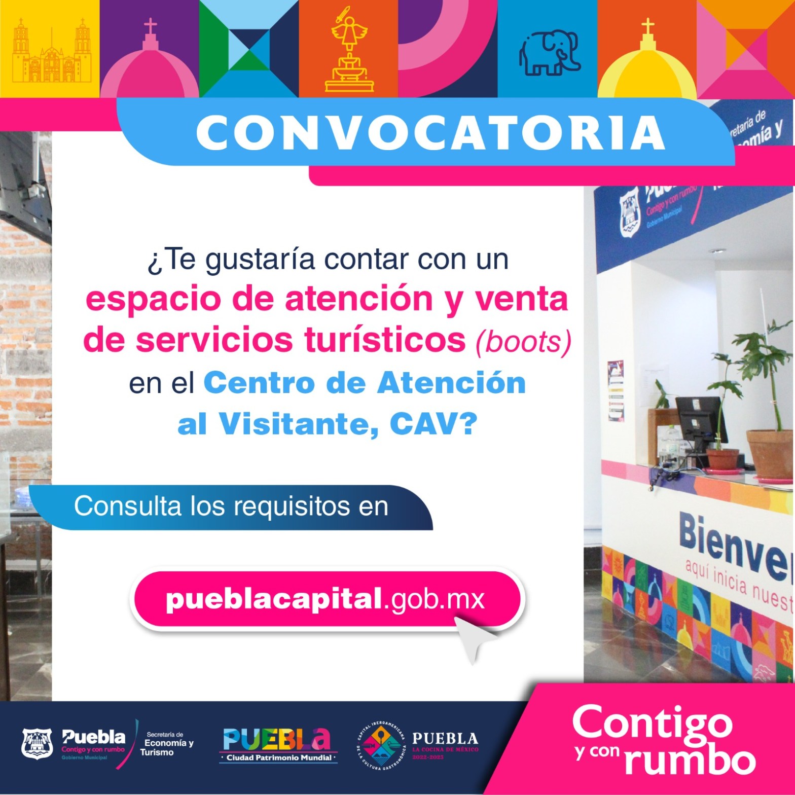 El Ayuntamiento de Puebla, a través de la Secretaría de Economía y Turismo, lanzó la convocatoria para ocupar un lugar en el Centro de Atención al Visitante, con la finalidad de continuar promoviendo los atractivos de la capital poblana y fomentar, difundir y consolidar la actividad en dicha materia.