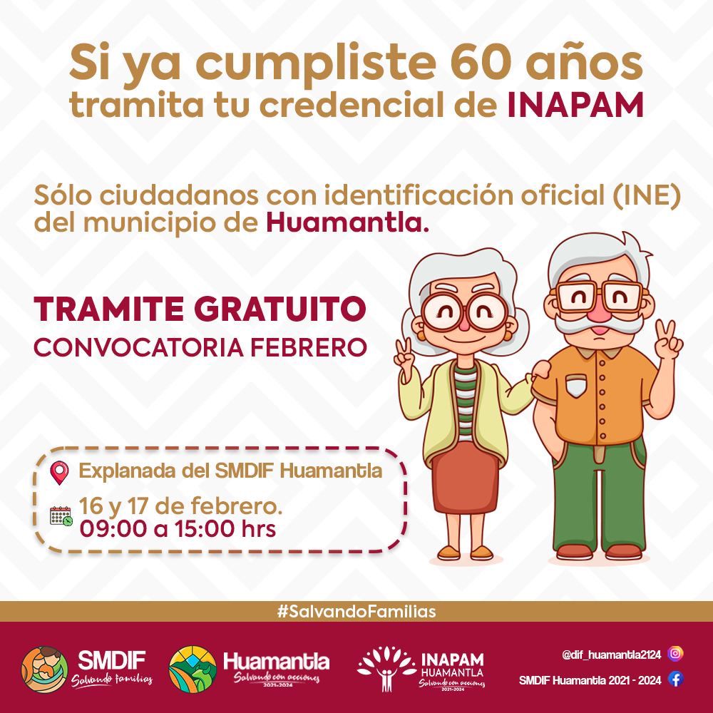 El Sistema Municipal para el Desarrollo Integral de la Familia (DIF) Huamantla, en coordinación con la Secretaría del Bienestar, iniciarán con la entrega de la credencial del Instituto Nacional de las Personas Adultas Mayores (Inapam), en beneficio de las y los huamantlecos a partir de los 60 años.