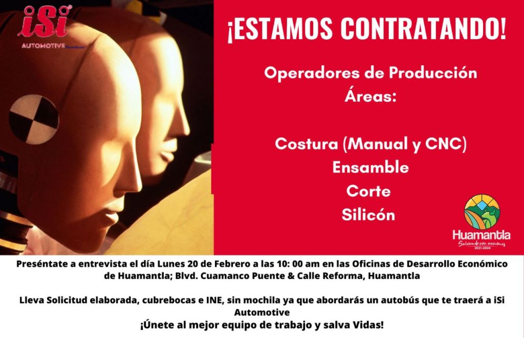 Este reclutamiento se realizará en las instalaciones de ISI Automotive, por lo que los aspirantes deberán presentarse en las oficinas de la Coordinación de Desarrollo Económico y Comercio de Huamantla, ubicadas en bulevar Cuamanco esquina con Reforma S/N, el lunes 20 de febrero a las 10:00 horas.