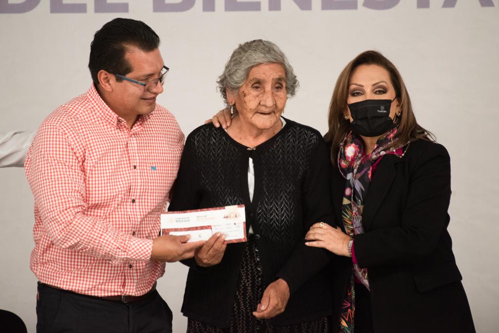 Los beneficiarios Minerva Sánchez Juárez, María Margarita Carrillo Cervantes, Palemón León Hernández, Gregorio Carrillo Carrillo y Keny Sosa Rivera también recibieron de la mano de la gobernadora Lorena Cuéllar sus tarjetas del Banco del Bienestar.