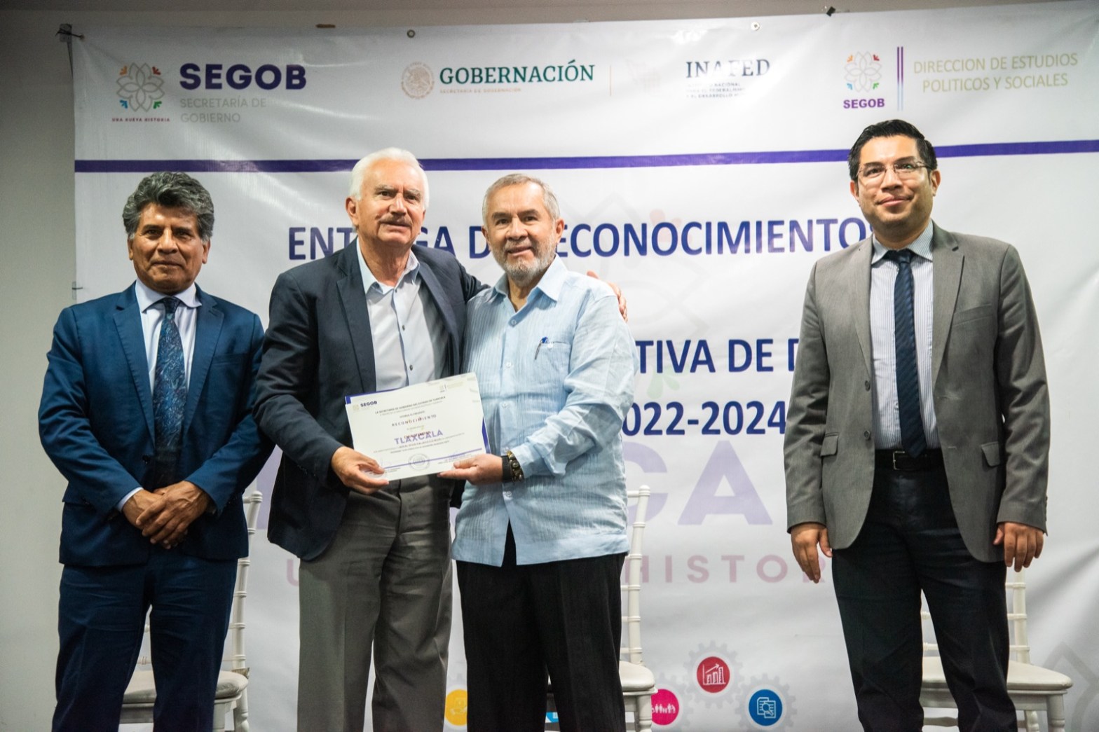 El titular de la Secretaría de Gobierno (Segob), Sergio González Hernández encabezó la ceremonia de entrega de reconocimientos del programa “Guía Consultiva de Desempeño Municipal 2022–2024” que entregó el Instituto Nacional para el Federalismo y el Desarrollo Municipal (Inafed) a 28 municipios de la entidad.