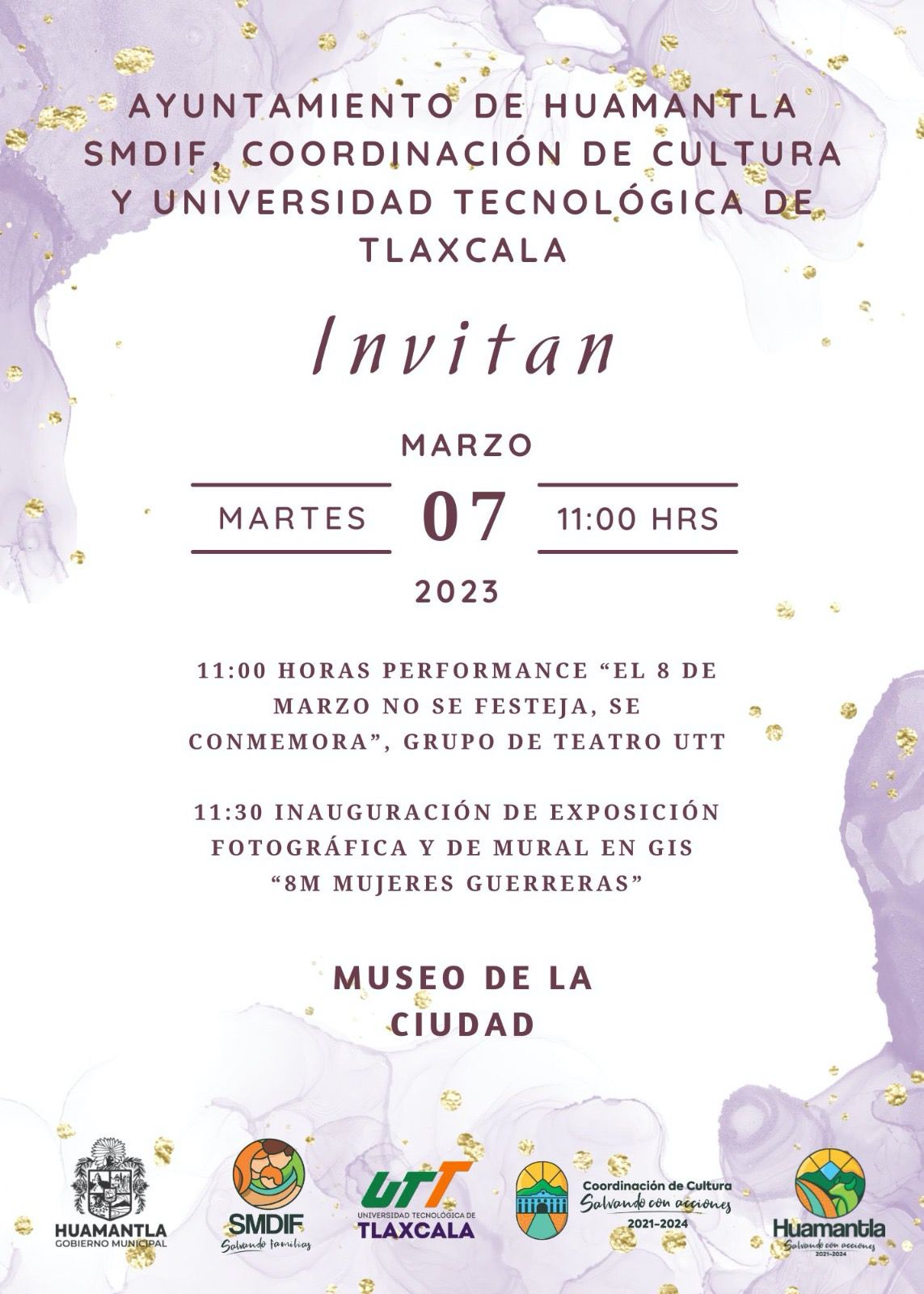 En el marco del Día Internacional de la Mujer, la Coordinación de Cultura del Ayuntamiento de Huamantla, invita este martes 7 de marzo a la sociedad en general a sumarse a las actividades en el Museo de la Ciudad ubicado en la Presidencia Municipal, frente al Parque Juárez.