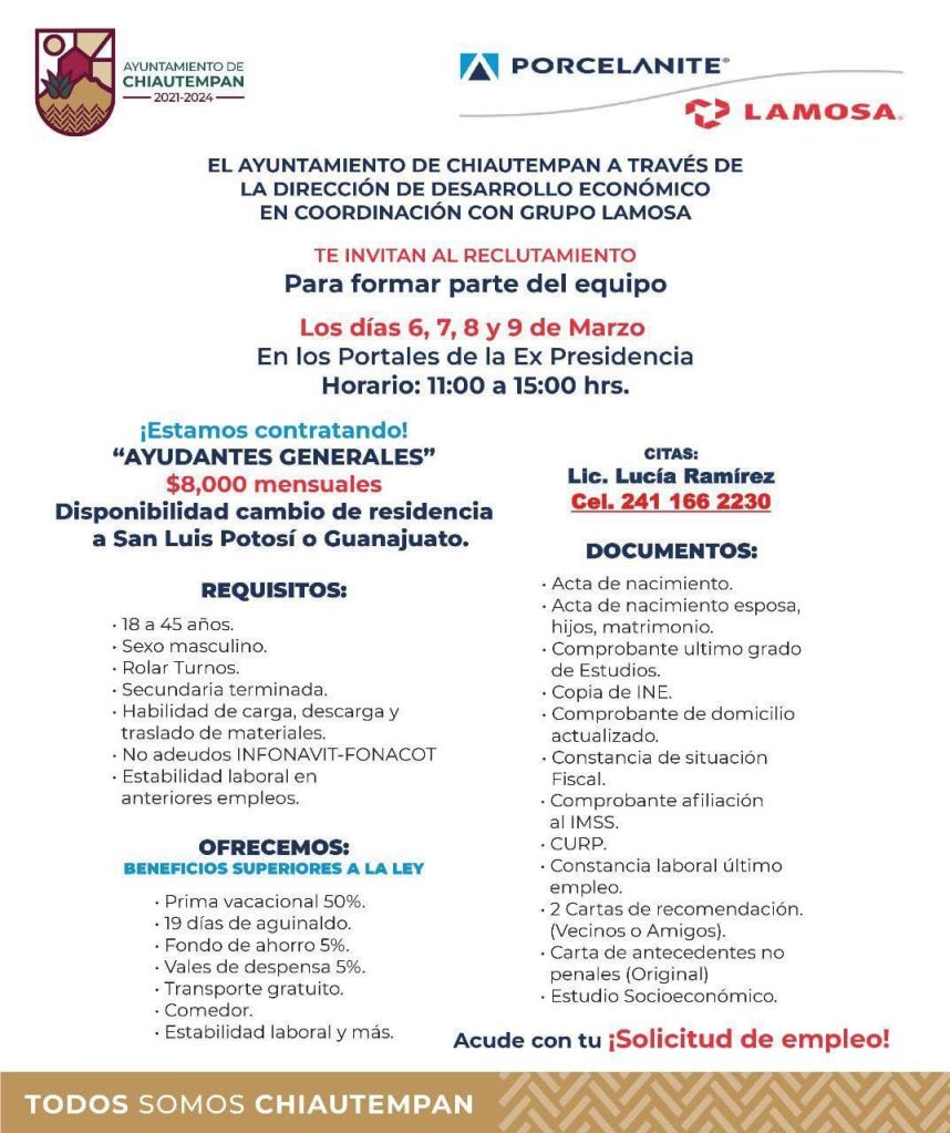 La Dirección de Desarrollo Económico del Ayuntamiento de Chiautempan en coordinación con Grupo Lamosa, anunció el inicio del proceso de reclutamiento para vacantes laborales en San Luis Potosí y Guanajuato.