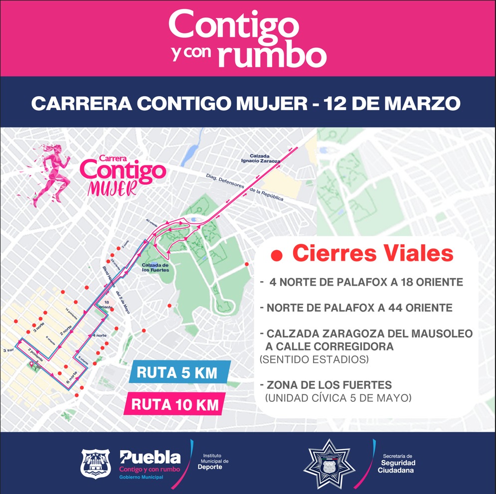 Se aproxima una de la ‘Carrera Contigo Mujer’ una de las más esperadas en la capital poblana con más de 2 mil 350 corredoras para este 12 de marzo, organizada por el Instituto Municipal del Deporte de Puebla con la Asociación Poblana de Atletismo; además del tradicional Gran Paseo, por lo que se realizarán algunos cierres de vialidades a partir de las 6:00 de la mañana.