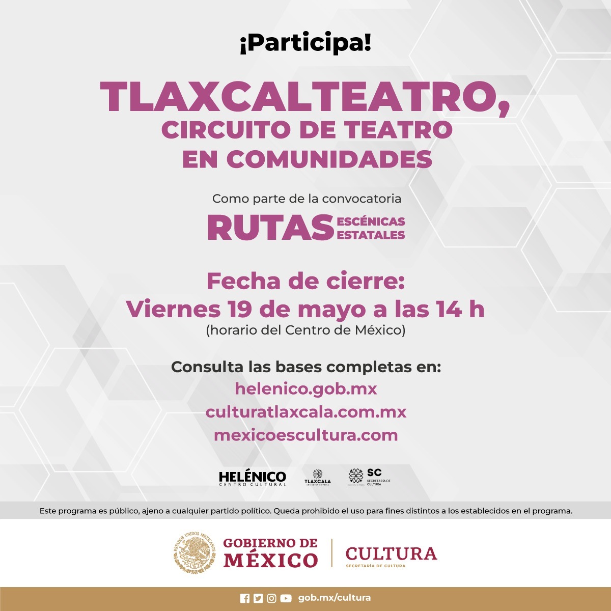 El gobierno del estado, a través de la Secretaría de Cultura (SC), en coordinación con la Secretaría de Cultura federal, invita a artistas escénicos locales a participar en la convocatoria “Rutas escénicas estatales 2023”, para ser parte de este esfuerzo coordinado que gestiona seis programas de impacto en cinco entidades, incluida Tlaxcala.