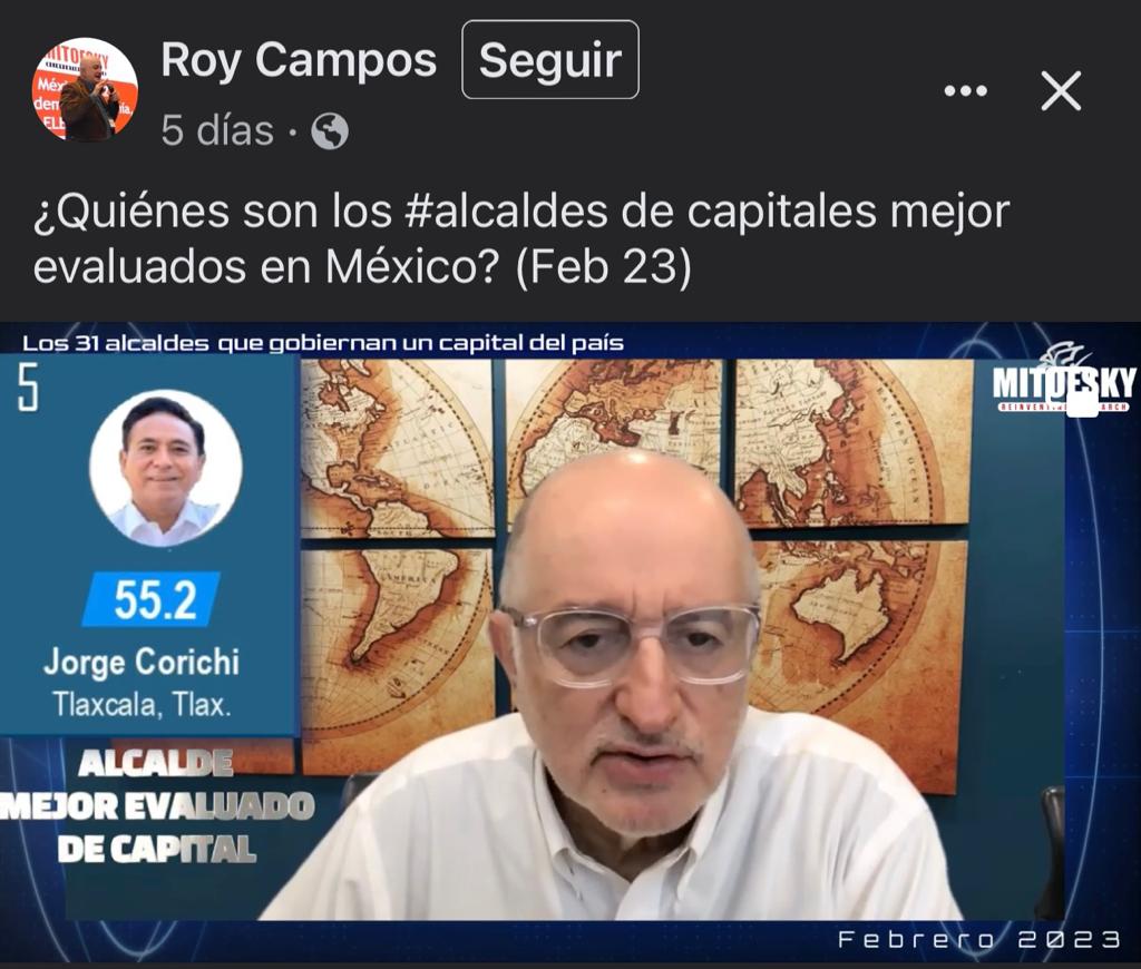 Jorge Corichi Fragoso, presidente municipal de Tlaxcala, permanece en el Top 5 de mejores alcaldes de México, de acuerdo a la última evaluación realizada por Consulta Mitofsky durante el mes de febrero.