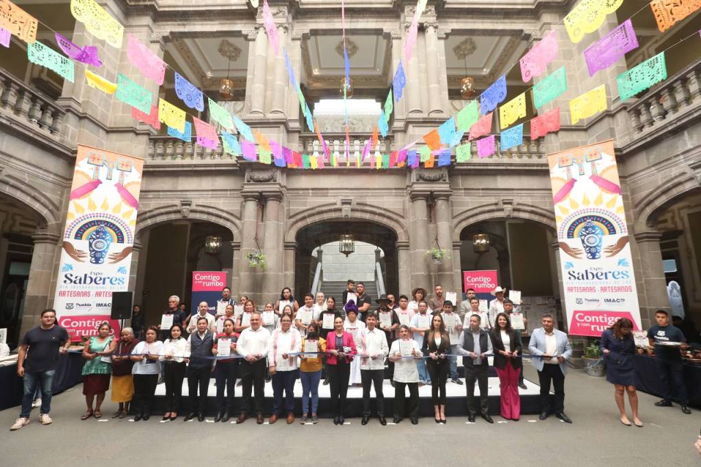 Momentos antes de inaugurar esta expo-venta que cuenta con la participación de 15 artesanos y artesanas provenientes de 11 municipios -Chigmecatitlán, Tepatlaxco de Hidalgo, Zapotitlán Salinas, Hueyapan, Tlaola, Naupan, Cuetzalan, Molcaxac, Amozoc y Puebla-, se otorgaron nueve reconocimientos a maestros y maestras considerados tesoros vivos de los saberes tradicionales, lo que para Eduardo Rivera Pérez, Presidente Municipal, es muestra de que tanto en Puebla como en México «nos sentimos profundamente orgullosos de su trabajo, de su historia de vida, de su labor».