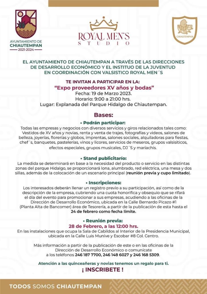 Este domingo 19 de marzo, la Dirección de Desarrollo Económico del Ayuntamiento de Chiautempan junto con el Instituto Municipal de la Juventud invitan a la gran expo-proveedores de XV años y novias, con la colaboración de 36 distribuidoras de prendas, calzado y demás artículos propios de tales eventos.