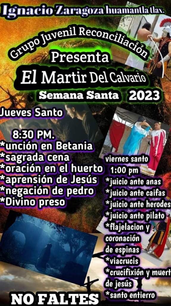 Invito a la ciudadanía en general para que acudan jueves Santo a partir de las 8:30 pm a la escenificacion de la Unción de Betania, la prisión de Jesús, la oración del huerto y el divino preso en la iglesia de Zaragoza.