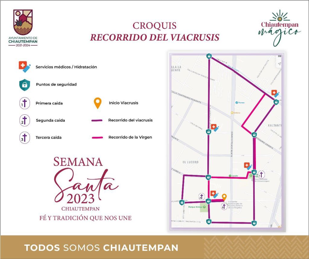 El Ayuntamiento de Chiautempan, informa sobre el cierre de vialidades que se llevará a cabo este viernes 7 de abril con motivo de la procesión del Viacrusis de la Semana Santa 2023.