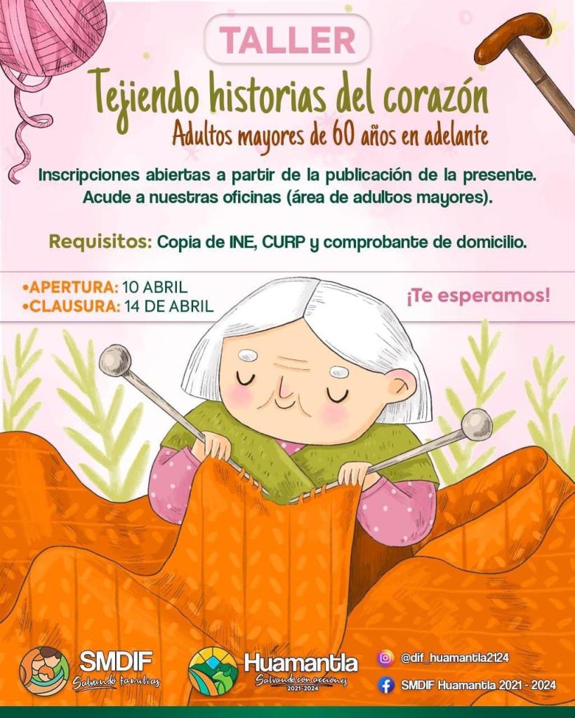 El Sistema Municipal para el Desarrollo Integral de la Familia (DIF) Huamantla, invita a todos los adultos mayores de 60 años a participar en el taller «Tejiendo Historias del Corazón”, que se llevará a cabo en sus instalaciones del 10 al 14 de abril.