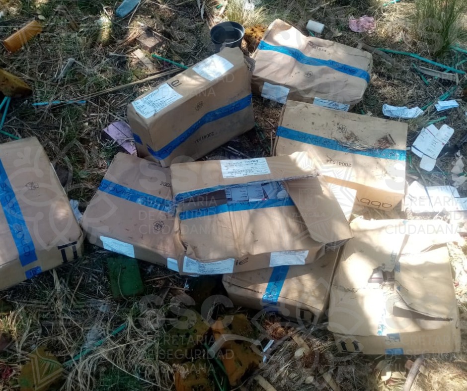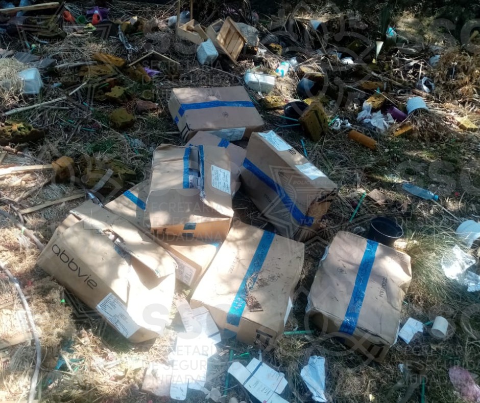 La Secretaría de Seguridad Ciudadana (SSC) a través del Grupo de Reacción adscritos a la Dirección de Seguridad Pública al realizar funciones de prevención, halló ocho cajas con probable medicamento caduco abandonadas en un terreno junto al panteón de la comuniad de San Cristóbal Zacacalco municipio de Calpulalpan.