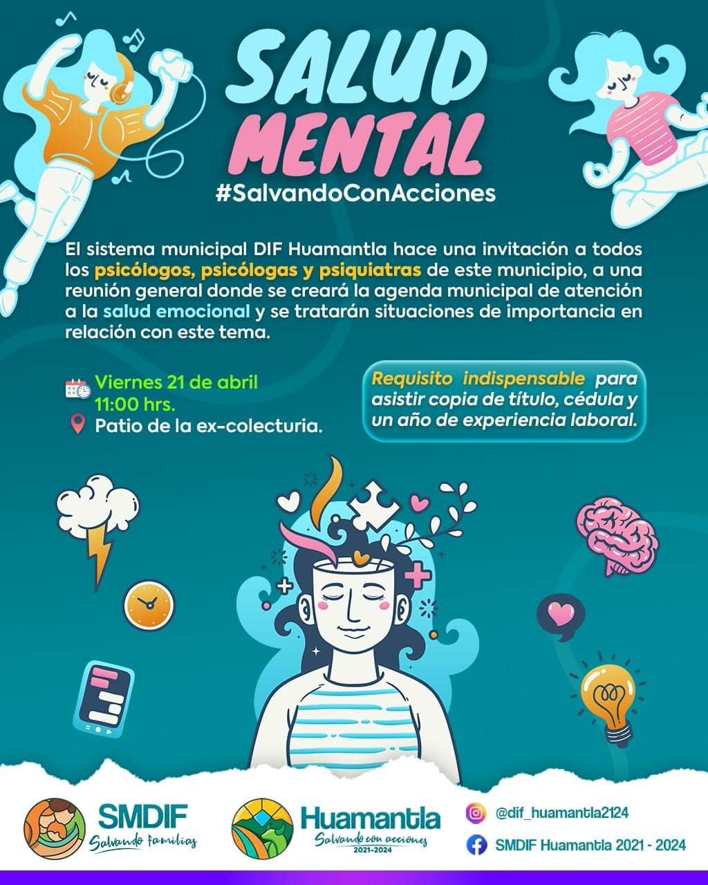 El Sistema Municipal para el Desarrollo Integral de la Familia (DIF) Huamantla, convoca a todos los psicólogos, psicólogas y psiquiatras del municipio a participar en una reunión general para plantear una agenda de atención a la salud emocional.