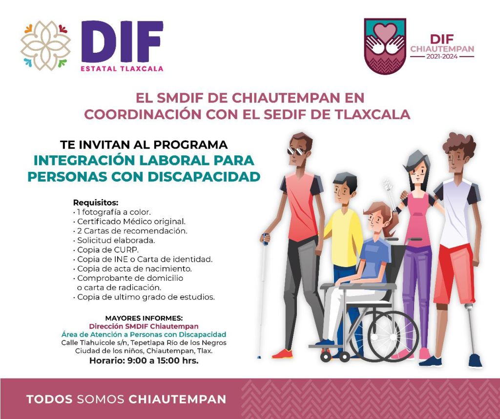 El Ayuntamiento de Chiautempan a través del Sistema Municipal para el Desarrollo Integral de la Familia (SMDIF), invita a participar en los programas dirigidos a personas con discapacidad sobre apoyos en tarifas de transporte público e integración laboral.