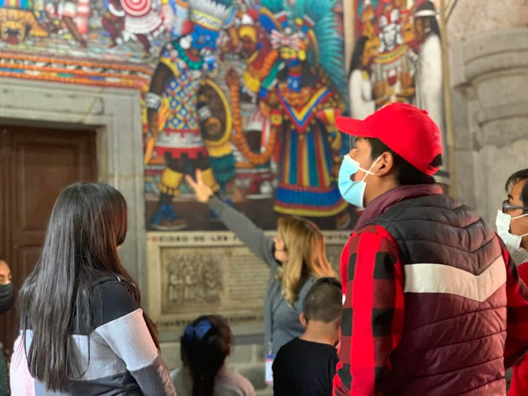 También se efectuó una visita guiada a los murales del Palacio de Gobierno del Maestro Desiderio Hernández Xochitiotzin (qepd), dónde Elena Minnullina, adscrita a la Dirección de Turismo Capitalino, explicó a las y los niños la representación de escenas fundamentales en la historia tlaxcalteca.