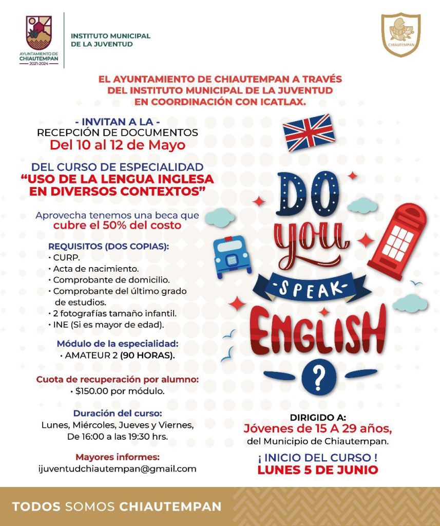 El Ayuntamiento de Chiautempan a través del Instituto Municipal de la Juventud (IMJ), invita a la población chiautempense de 15 a 29 años de edad a inscribirse al curso de especialidad «Uso de la lengua inglesa en diversos contextos».