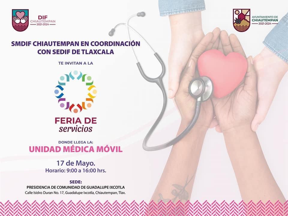 El Ayuntamiento de Chiautempan a través del Sistema Municipal para el Desarrollo Integral de la Familia (SMDIF) y con el apoyo del Sistema Estatal DIF (SEDIF) invitan a la población de Guadalupe Ixcotla a acudir a la Feria de Servicios que se instalará en la comunidad el próximo 17 de mayo del presente año.