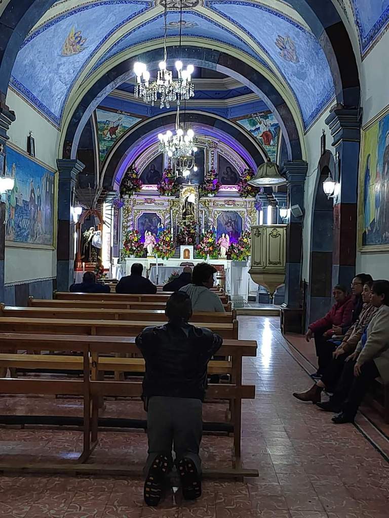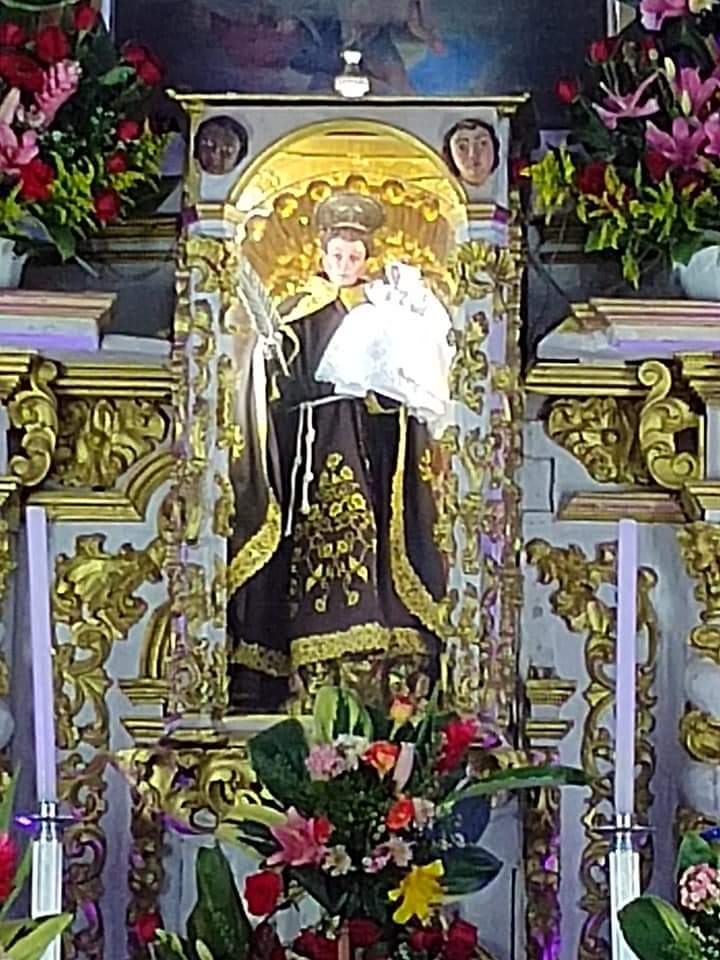 La túnica de la imagen milagrosa siempre esta cubierta por pequeñas fotografías del novio o trencitas con listones de la novia que le piden al santo patrón que pronto le haga el milagro.