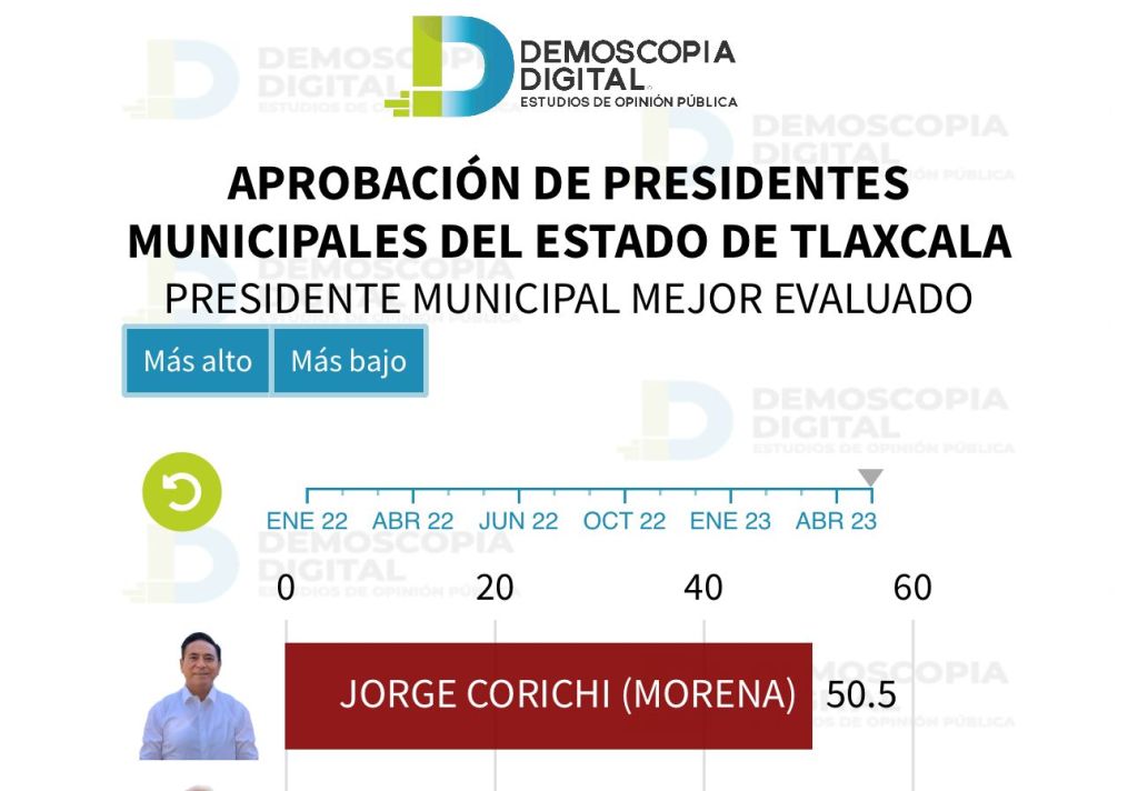 A lo largo del 2023, el alcalde de Tlaxcala Capital, Jorge Corichi Fragoso, se ha posicionado como el mejor evaluado de entre los ediles de los 60 municipios de la entidad, de acuerdo a reportes de la casa encuestadora con Demoscopia Digital, con calificaciones aprobatorias.