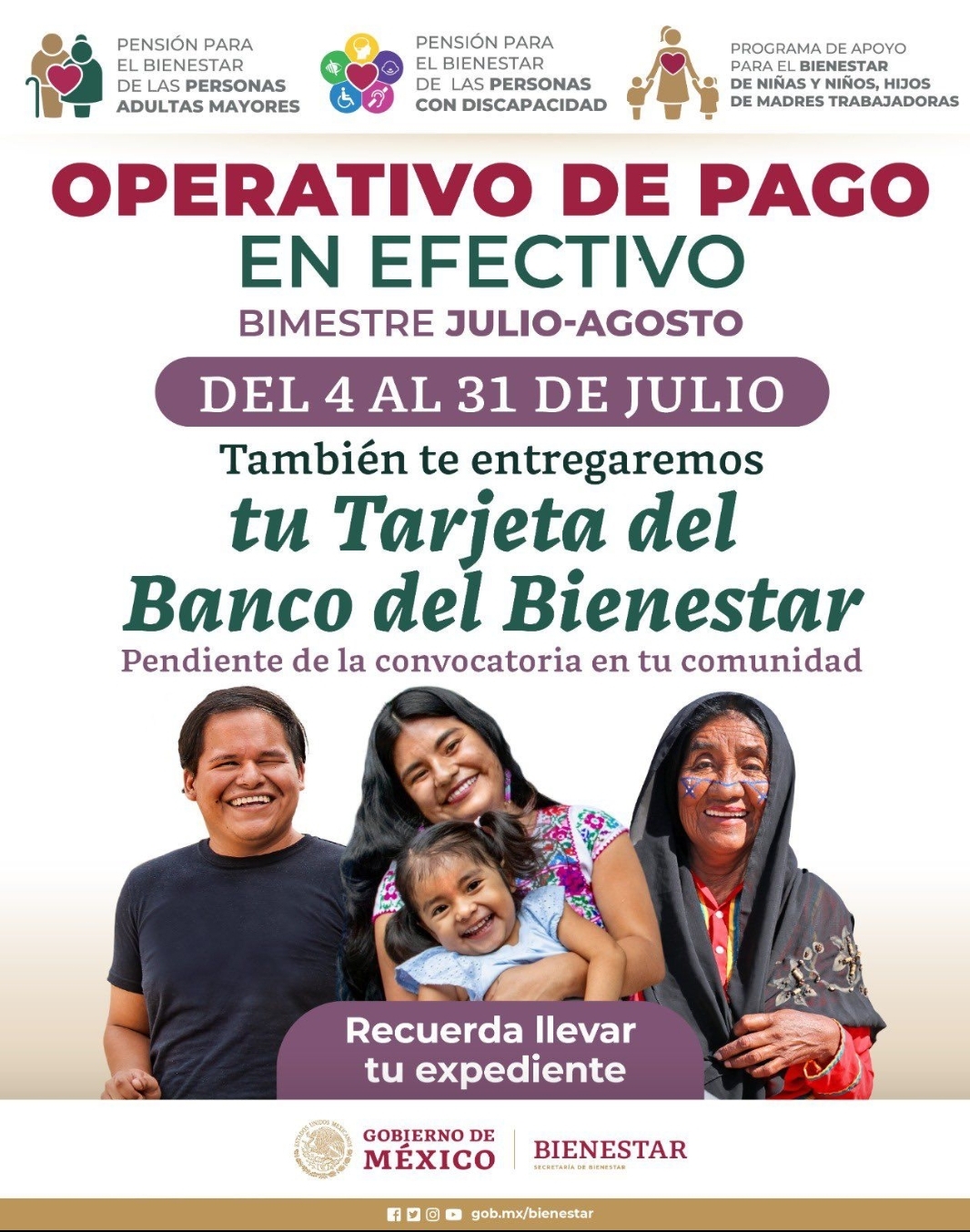 El Ayuntamiento de Tlaxcala informa que el pago de pensión para adultos mayores y personas con discapacidad, que lleva a cabo la Secretaria de Bienestar del Gobierno de México, se realizará el próximo martes 25 de julio.