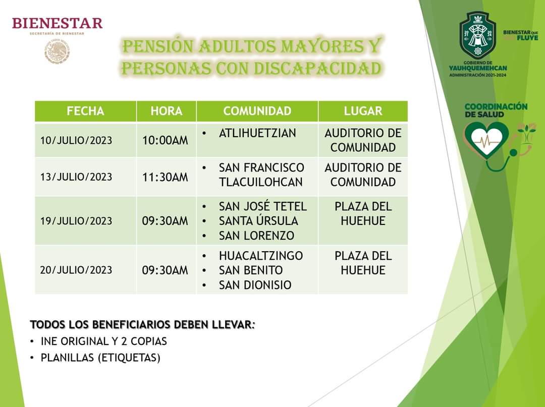 El Gobierno de Yauhquemehcan 2021-2024 a través de la coordinación de salud, #Informa a las ciudadania sobre el calendario de «Pago de Pensión para Adultos Mayores y Personas con Discapacidad», así mismo informamos es el último operativo en mesa de pago, quien no acuda, no habrá retroactivo. #QueNoSeLesPase #BienestarQueFluye