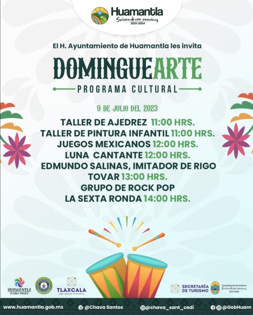 El H. Ayuntamiento de Huamantla que preside Salvador Santos Cedillo, a través de la Coordinación de Cultura, presentarán una cartelera atractiva este 9 de julio con el programa “Dominguearte”