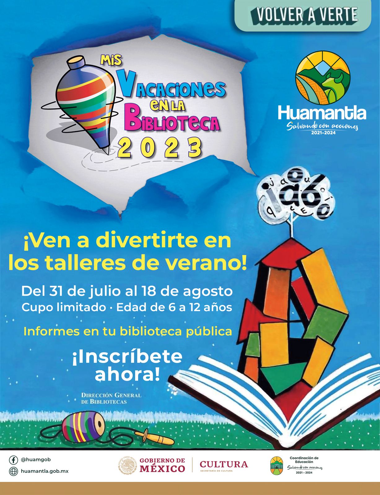 El H. Ayuntamiento de Huamantla que preside Salvador Santos Cedillo, a través de la Coordinación de Educación, invita a las niñas y niños del municipio a participar en el curso de verano “Volverte a Ver”, del 31 de julio al 18 de agosto en la biblioteca municipal.