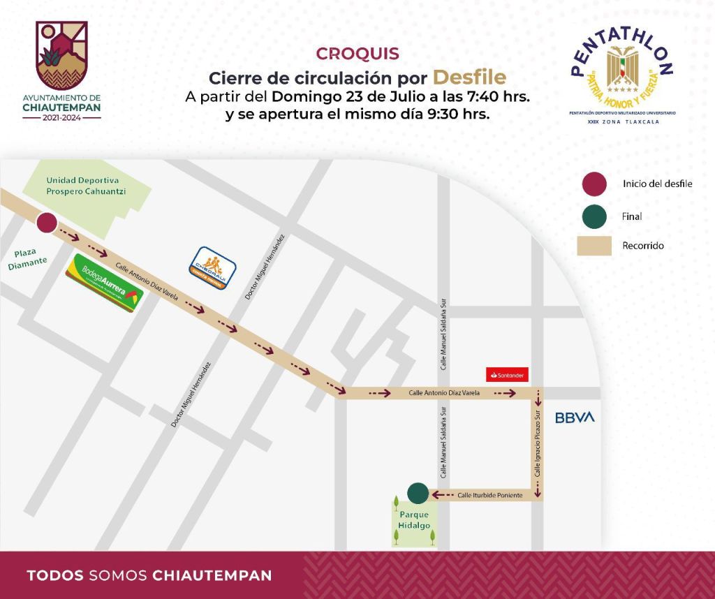 El Ayuntamiento de Chiautempan a través de la Dirección de Desarrollo Económico y la Dirección de Seguridad Pública, Vialidad y Protección Civil, informan sobre los cierres de calles que se realizarán este domingo 23 de julio por motivo del Desfiel del Pentathlon Deportivo Militarizado Universitario.