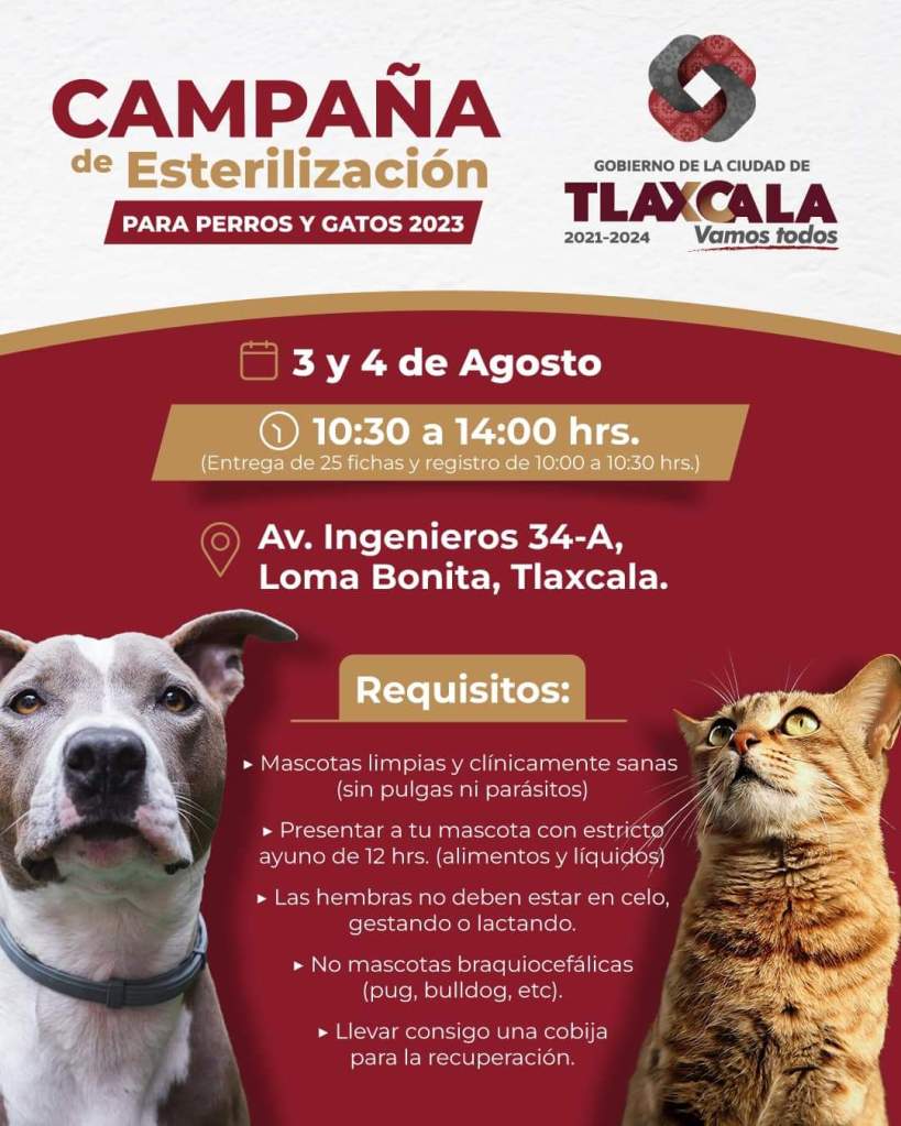 Los días 3 y 4 de agosto, se instalará un módulo de esterilización para realizar el procedimiento a felinos y caninos mayores a 6 meses, clínicamente sanos y con ayuno de 12 horas.